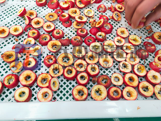 二、接下來就是進(jìn)行護(hù)色處理,一般多用0.5%異維生素C溶液浸泡10-15分鐘,防止果片變色并盡快瀝干水分,均勻的將山楂片平鋪向托盤中,隨后放進(jìn)烘干機(jī)里。