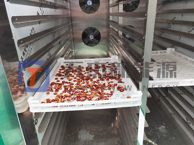三、山楂烘干溫度:然后烘干過程山楂烘干房溫度控制在60°C---65°C,當(dāng)山楂的含水量在15%左右時(shí)溫度需要逐漸減小,該過程約在12--15個(gè)小時(shí)左右。山楂的水份含量大,在烘干過程中,相對(duì)濕度在70%以上時(shí)需增大通風(fēng)排濕,使其山楂烘干均勻品質(zhì)好。