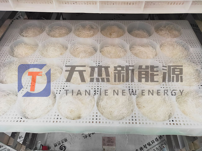 阜陽粉條烘干機(jī)客戶操作工藝預(yù)覽 將清理加工后的粉條均勻規(guī)則的放入烘盤磨具中盛制阜陽粉條烘干機(jī)設(shè)備內(nèi)調(diào)好參數(shù)準(zhǔn)備烘干。 阜陽粉條烘干房粉條烘干質(zhì)量效果如下: